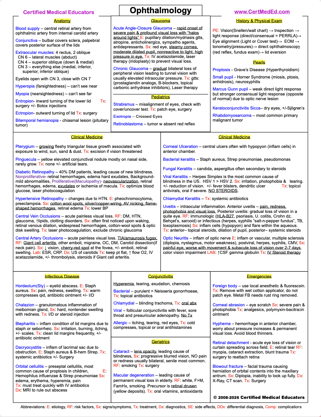 These summary review sheets are a trademark invention of Certified Medical Educators to help you study during your busy life of clinical practice, family and personal time. An ophthalmology example is given below and the entire pack of these sheets (Cardiology, Pulm, GI, MS, Women’s Health, Psych, Neuro, and more) are available on our website. Use these to help you study when between seeing patients, during a TV commercial or between breaks while taking your boards.